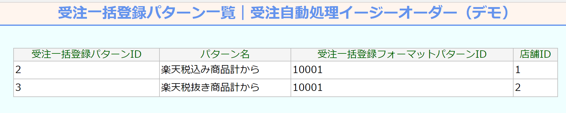 ・受注一括登録パターンID:受注一括登録パターン一覧をクリックして 「受注一括登録パターン一覧]画面を表示、