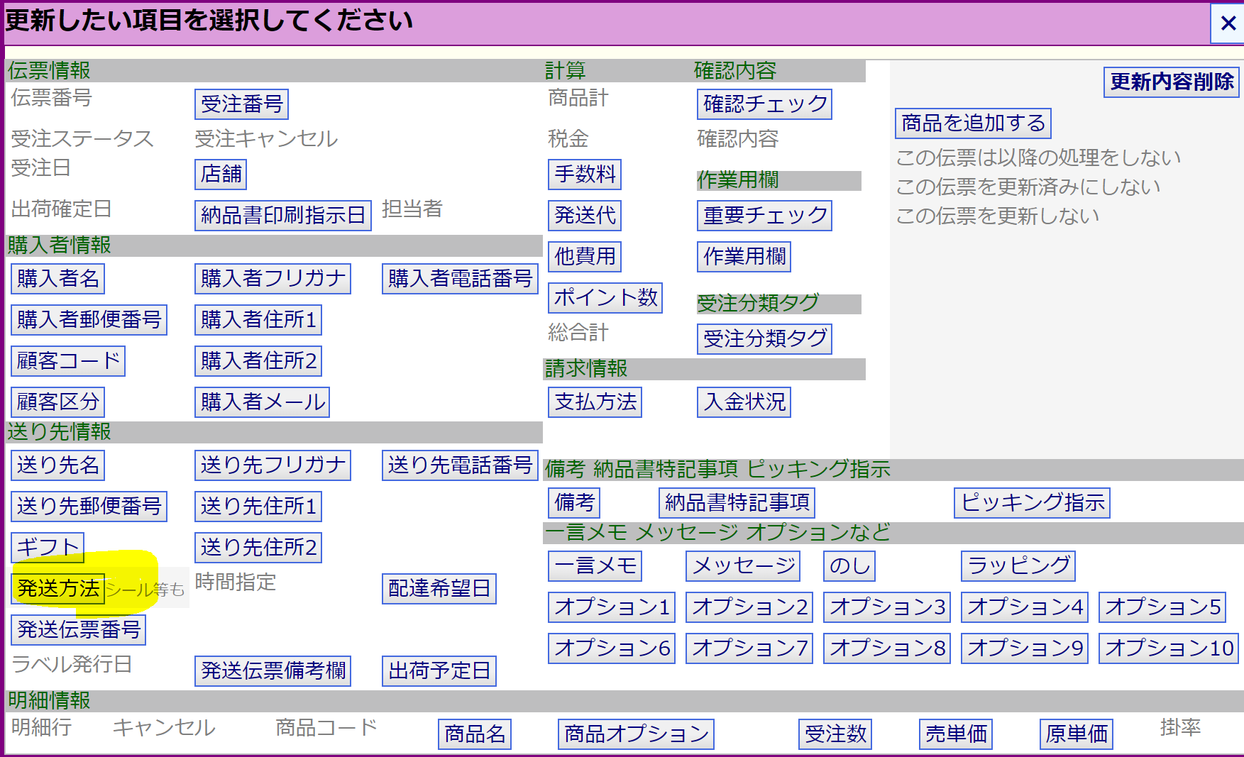 (1) 「伝票の項目を選択して更新する」をクリックする。