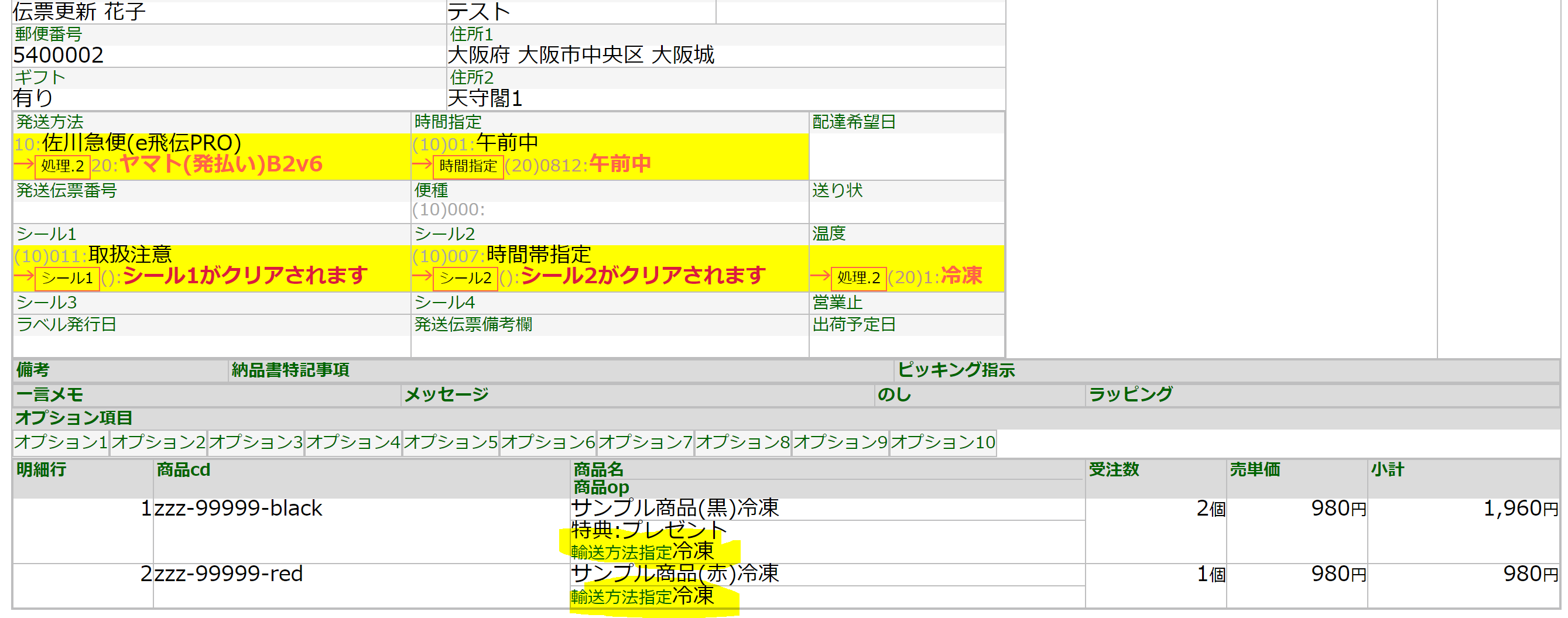 ↑この例では、輸送方法指定が冷凍である商品が有るので、 発送方法が更新される。