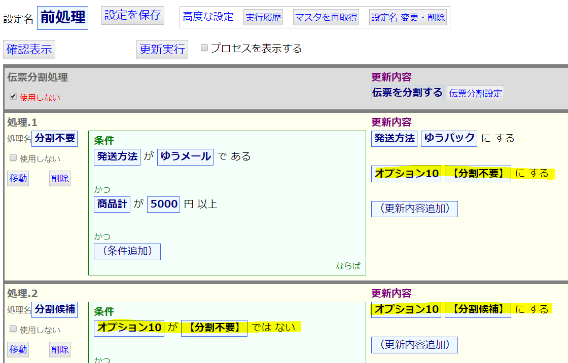 設定名「前処理」にて発送方法を「宅配便」にした伝票以外を、 設定名「分割処理」の処理対象とする。